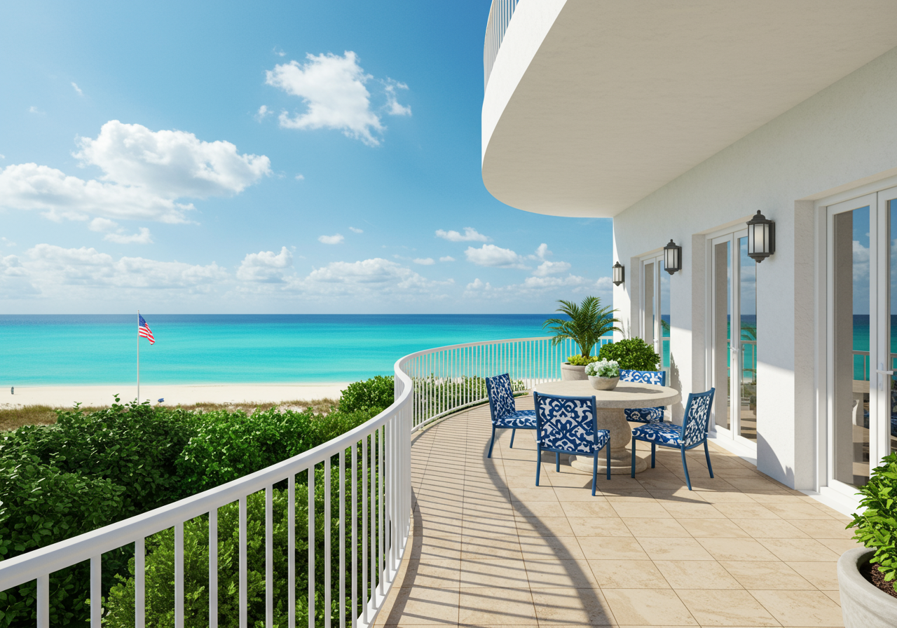 The terrace of an oceanfront penthouse follows the curve of the condominium building at 100 Royal Palm Way. The rare-to-the-market penthouse sold in September for its asking price of $15 million.