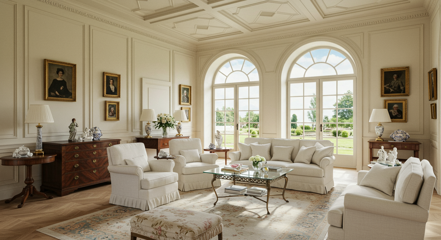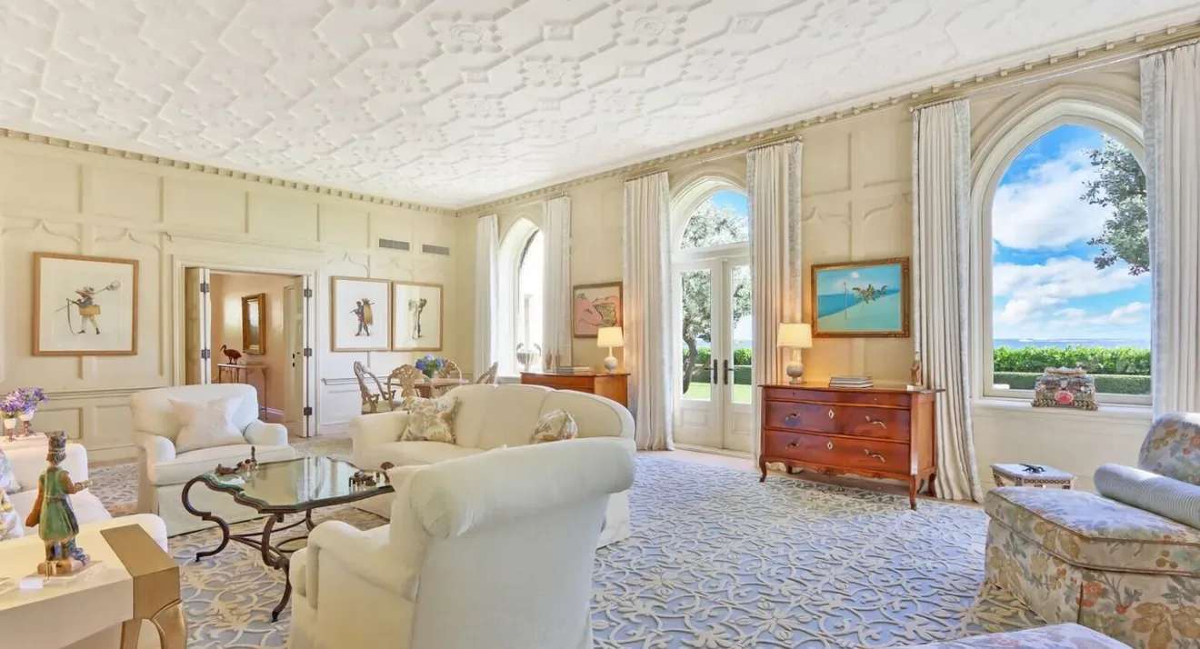 The oceanview living room at 550 S. Ocean Blvd. in Palm Beach has an elaborate plasterwork ceiling. PictureItSoldFL.com