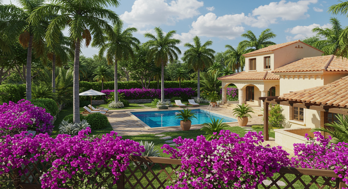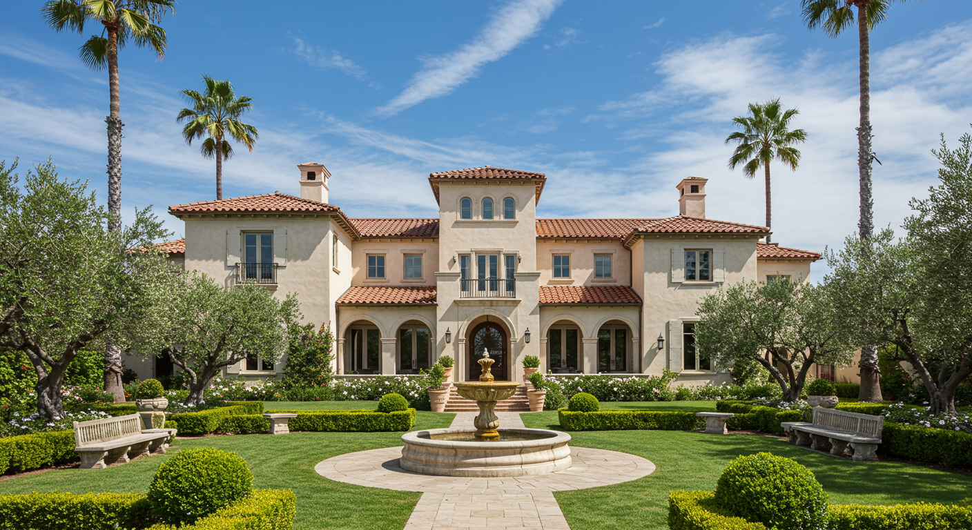 The extensively landscaped backyard features a pool and terraced gardens. A second-story veranda atop the loggia faces the pool area.